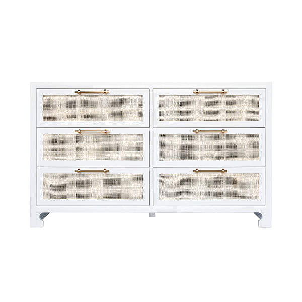 British West Indies style with a modern flair, this extraordinary 6 drawer chest showcases natural, hand-woven caning on a crisp, matte white canvas.  The result is a sublime composition that embodies casual elegance. Whether placed in a coastal retreat or downtown loft, Carla complements any design motif.