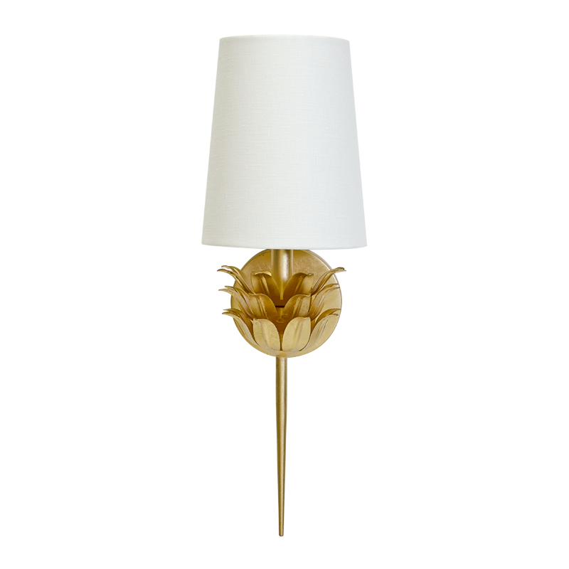 Add a cozy interplay of light and shadow to any room with this elegant, one-arm sconce featuring a graceful, three-layer botanical motif.  Finished with hand-applied gold leaf and topped with a white linen shade, Delilah evokes an inviting, radiant sophistication, especially when paired to accentuate a mirror or secretary.