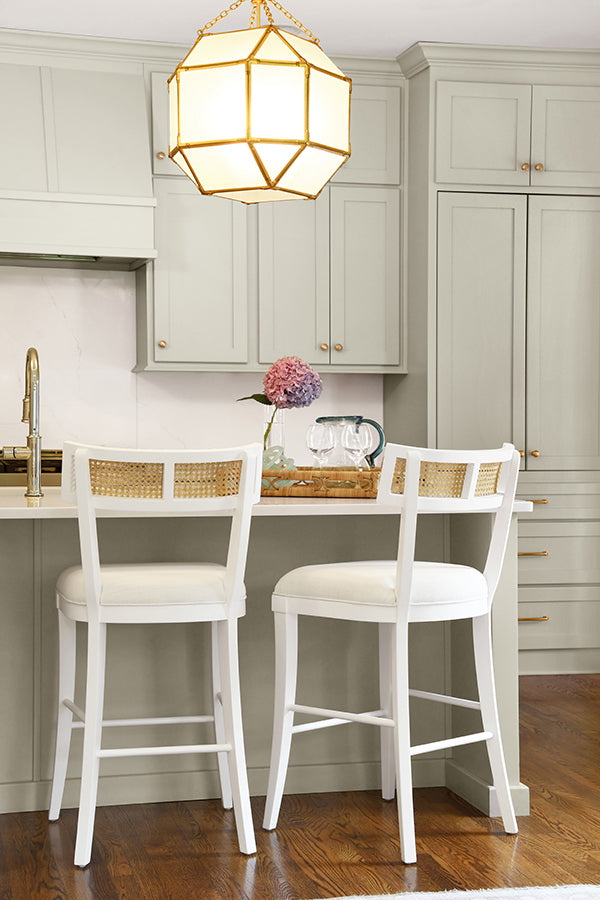 Inspired by one of the first and most iconic furniture designs in history, our Britta counter stool is a modern rendition of the classic Greek klismos chair. Pairing a matte white lacquer finish with a pristine white linen seat, its curved back with natural woven cane detail wraps you in comfort. Britta is the very definition of casual elegance.