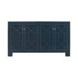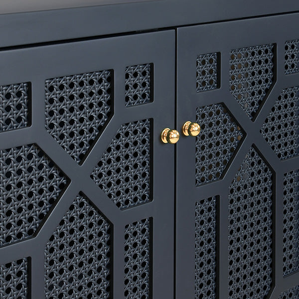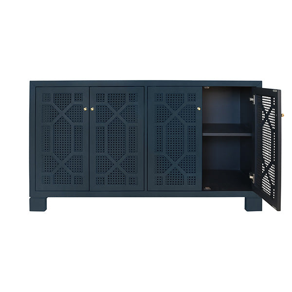 FOUR DOOR BUFFET WITH TRELLIS OVER PAINTED CANE DOORS IN MATTE NAVY LACQUER WITH TWO ADJUSTABLE AND REMOVABLE SHELVES.