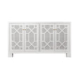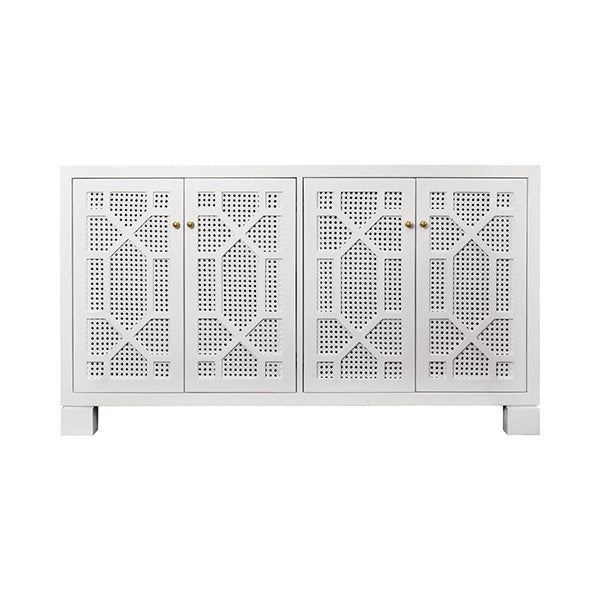 FOUR DOOR BUFFET WITH TRELLIS OVER PAINTED CANE DOORS IN MATTE WHITE LACQUER WITH TWO ADJUSTABLE AND REMOVABLE SHELVES.