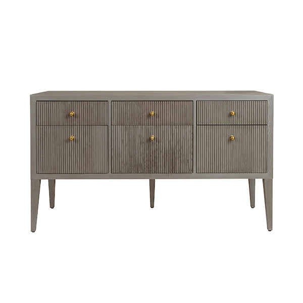 The Palmer in our custom smoke grey oak finish mixes classical fluted design and ample storage to bring you a show stopping buffet that is functional and visually captivating! Simple but elegant ball brass knobs adorn each drawer. Six drawers on soft close glides allow you to store away your serving ware until company arrives. Leave your guests in awe with the stunning artisan-crafted Palmer SG.