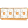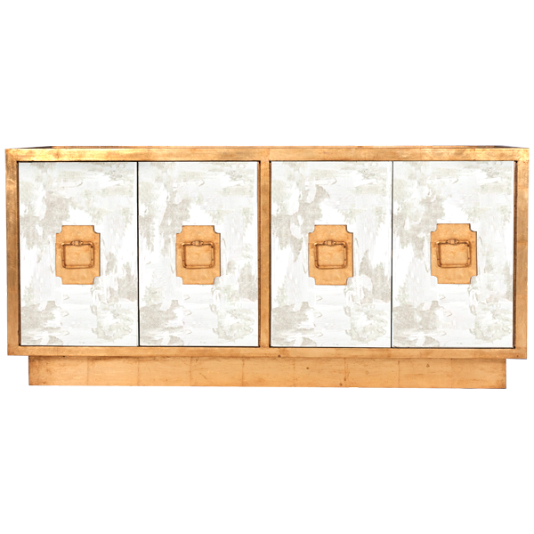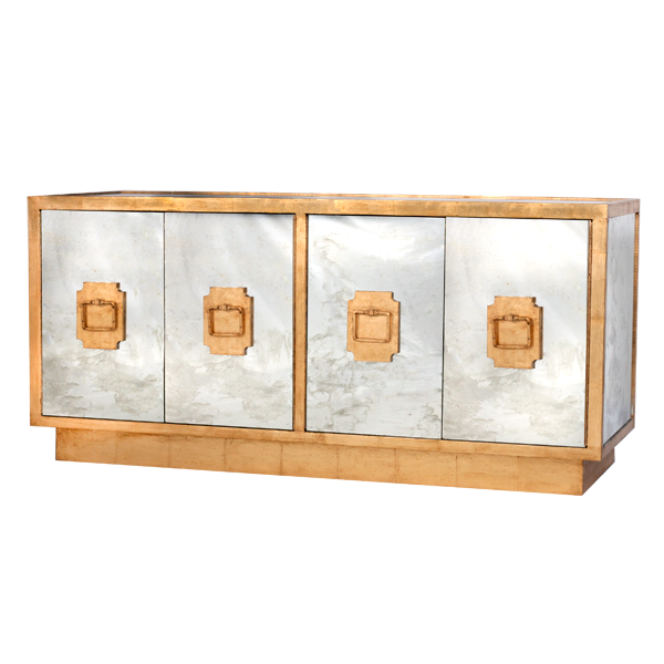 Looking to amp up your style with megawatt glamour? Our Ponti four-door console is an extraordinary pairing of one-of-a-kind antique mirror overlaid with hand-applied, gold leaf overlay and border. Greek key base detail and gold square hardware elevate this show piece to five star status. Fixed interior shelves and cut-outs for media wire management in each cabinet.