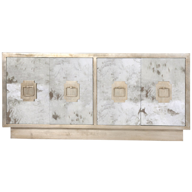 Looking to amp up your style with megawatt glamour? Our Ponti four-door console is an extraordinary pairing of one-of-a-kind antique mirror overlaid with hand-applied, champagne silver leaf overlay and border. Greek key base detail and matching square hardware elevate this show piece to five star status. Fixed interior shelves and cut-outs for media wire management in each cabinet.