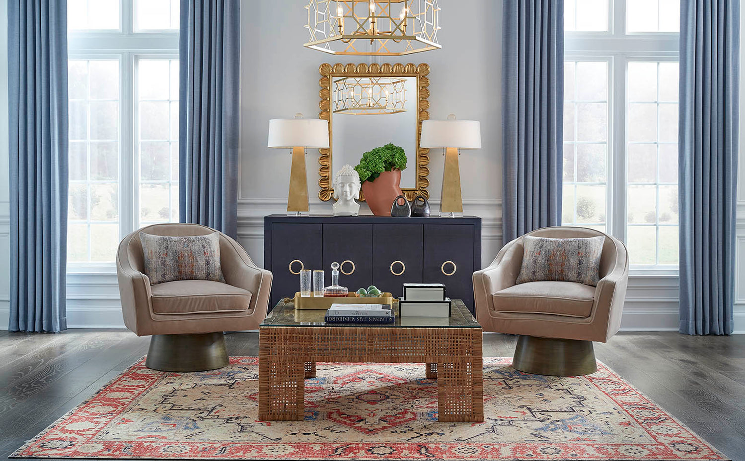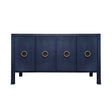 FOUR DOOR BUFFET WITH ANTIQUE BRASS CIRCLE HARDWARE IN TEXTURED NAVY LINEN
