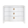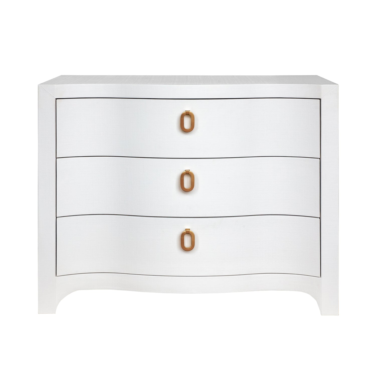 Embrace coastal chic elegance with the Cora WH chest! This exquisite curved-front chest features three drawers equipped with soft close glides, ensuring a harmonious fusion of functionality and sophistication. Three satin brass ring pulls adorn the chest like jewels. Wrapped in a luxurious light blue texture linen or white textured linen, the Cora creates a symphony of dimension and elegance. Let the Cora’s coastal charm transform your home into a sanctuary of refined coastal bliss and relaxed luxury.