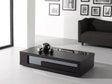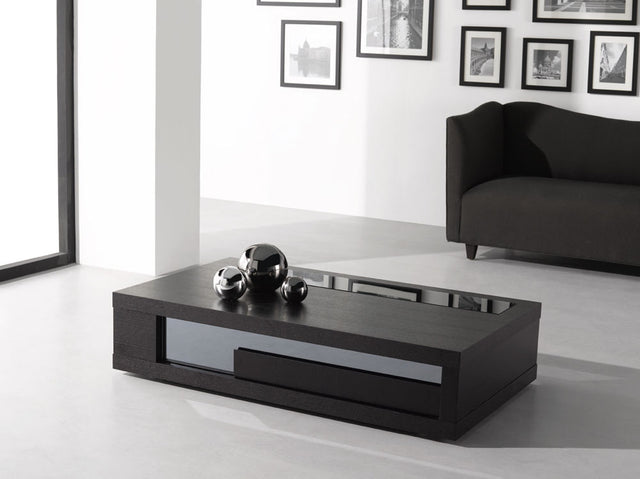 The 900-A Modern Coffee Table is crafted with a sophisticated wenge wood veneer and a sleek glass top, providing a contemporary touch that complements any living room decor.