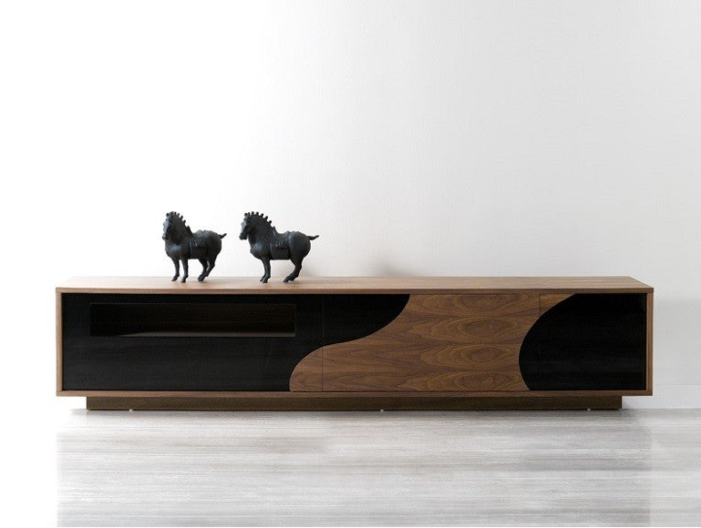 The Modern 101F TV Base effortlessly combines walnut veneer with a black high gloss finish, presenting a sophisticated and contemporary centerpiece for any living room.