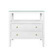 TWO DRAWER SIDE TABLE WITH OPEN TOP SHELF IN TEXTURED WHITE LINEN WITH POLISHED BRASS KNOBS AND GLASS TOP