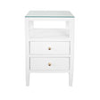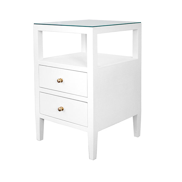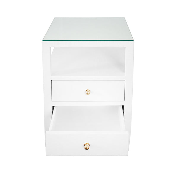 With its sophisticated form and subdued texture, the Roscoe side table brings style and elegance to any room. Two drawers with petite polished brass knobs sit elegantly beneath an open storage shelf. Finished in lacquered white linen, it's the perfect accompaniment to your favorite chair. Roscoe comes with a removable glass top and soft close glides.