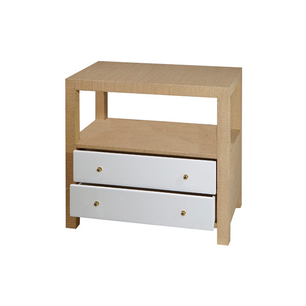 The Hattie two drawer side table brings style and grace to any room. Matte white lacquer finish with petite brass pulls sit elegantly within a coordinating natural grasscloth frame.