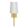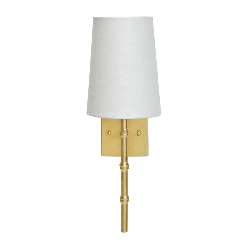 Our petite Molly sconce offers a dose of tropical detail with its bamboo styling.  Features a linear base hand finished in gold leaf with a crisp white linen shade.  Decorate your powder room with these paired on opposite sides of your favorite mirror.